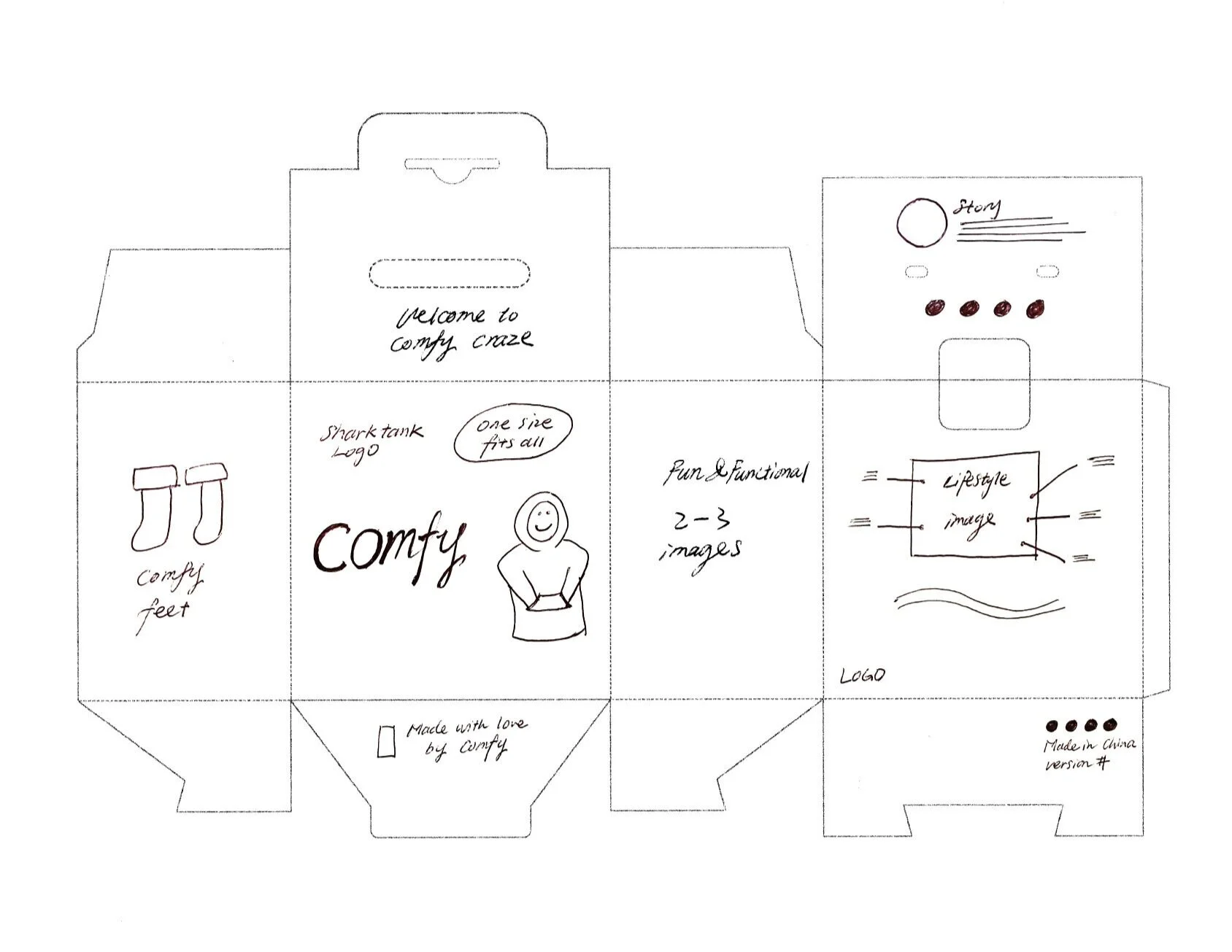 Working with the marketing specialist who created the content for packages, we have discussed and come to the conclusion that the front of the box would show the main image, logo and call to action. The sides would be utilized to promote other products and show more images. The back would include features and a lifestyle image of models wearing the products in an interior setting. Knowing where everything goes assisted me visualize the design better. Then, I made some sketches.